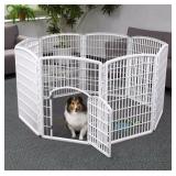 IRIS Plastic Puppy and Dog Pet Playpen. The IRIS 34'' Exercise 8-Panel Pet Playpen with Door can be utilized indoors or outdoors; the pet playpen is portable and provides 21 square feet of exercise space for pets! Each panel measures 24.6"W x 34"H; door measurements 14.5''W x 20''H; the distance between bars is 1.5''. Dimensions: 63"L x 63"W x 34"H. Item is in retail packaging! Retail $100.88 |