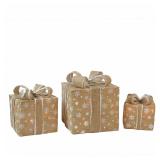 Set of 3 Lighted Natural Snowflake Burlap Gift Boxes Christmas Yard Art Decorations. Total of 40 clear lights Indoor/outdoor Boxes are not connected Separate plugs Burlap. Item is in damaged retail packaging. Retail $49.98 |