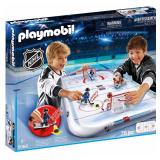 PLAYMOBIL NHL Hockey Arena. Skate into action with your own hockey match at the NHL Hockey Arena The four NHL players feature a movable arm and hockey stick for even more realistic game play Simply pull back the lever to swing the stick and fire the puck down the rink Use the goalie to defend against offensive plays by clipping the player to the goal and then using the joystick to maneuver the goalie Kids can customize each player to represent their favorite NHL team using the included decals. Item is in retail packaging. Retail $44.99 |