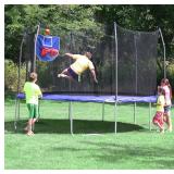 Skywalker Trampolines 15-Feet Jump N' Dunk Trampoline with Safety Enclosure and Basketball Hoop. This comes with 2 boxes and both are here. Reinforced t-bracket construction provides greater structural stability at each enclosure and trampoline joint. Patented no-gap enclosure System attaches net to jump mat at each spring, eliminating gaps. Tightly woven polyethylene enclosure net for excellent durability and UV protection. Woven jump mat made of heavy-duty UV protected polypropylene to prevent slipping. Meets or exceeds ASTM safety standards. Safe play basketball hoop and ball made of soft materials. Basketball hoop features break away Velcro rim to ensure minimum impact on enclosure net and poles. BOTH BOXES ARE PRESENT! DUE TO LIMITED WAREHOUSE SPACE, THIS ITEM MUST BE PICKED UP DURING SCHEDULED PICK UP TIME. PLEASE BRING LOADING HELP. Item is in retail packaging! Retail $329.99 |
