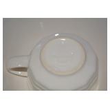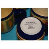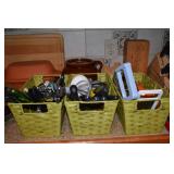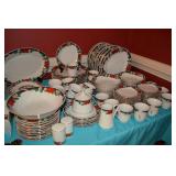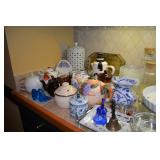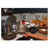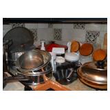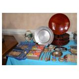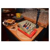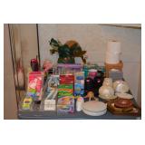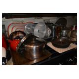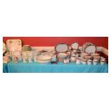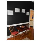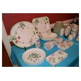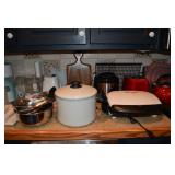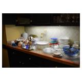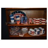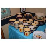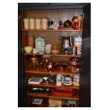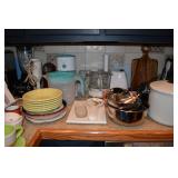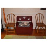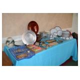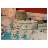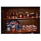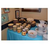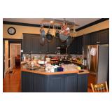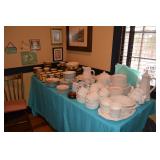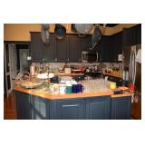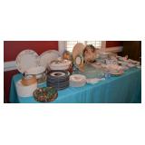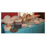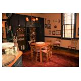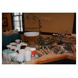 Kitchen: Small Oak Kitchen Table, Set of 6 Antique Painted Chairs, Two Sets of Pfaltzgraff, Everyday dishes, Utensils, Coffee Maker, Kitchenaid Red Toaster, Chopper, Blender, Cuisinart, Corningware, Tupperware, Pots and Pans, Bakeware,4th of July China, Copper Serving Ware, and More.