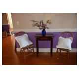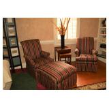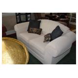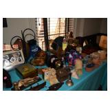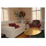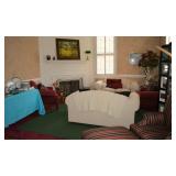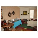 Living Room: Pair of Matching Ethan Allen Loveseats, Pair of Matching Upholstered Side Chairs, Brass Tray Top Coffee Table, Nesting Tables, Frame Screen, Dining Room Table, Rugs, Lamps, Smalls, Christmas Accessories, Books, Country Living Collection in Hardback, China, Glassware, and More.