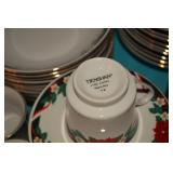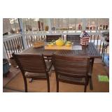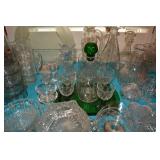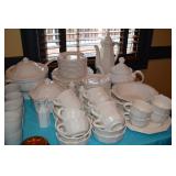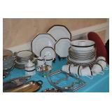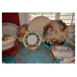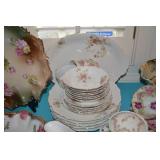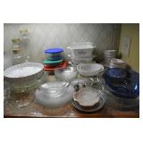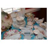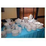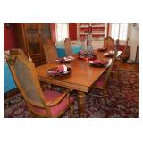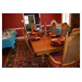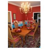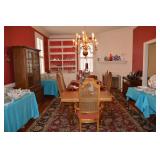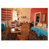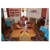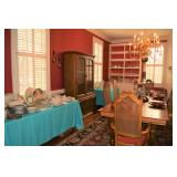 Dining Room: Rectangular Oak Dining Room Table with 4 leaves and 6 chairs, China Cabinet with Glass Front, Buffet, Glassware, Crystal, China (Limoge, Bavarian, Lenox, Tienshan, Studio Nova Garden Blossom), Rug, and More.