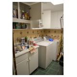 Laundry: Kenmore 800 Washer and Dryer, Cleaning Supplies, Hamper, Shark Cordless Vacuum, and More.