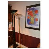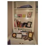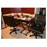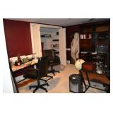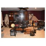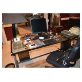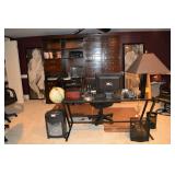 Office: Contemporary Glass Desks, Lamps, Black Leather Chair with Ottoman, Large Wood Hutch with File Drawers, Dell Monitor, Art, Standing Globe, Computer Accessories, Stand Alone File Cabinet, Shredder, Dell Computer, Scanner, Office Chairs, Office Supplies, Lamps, Books, Storage Containers, Set of Cordless Phones, and More.