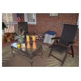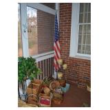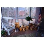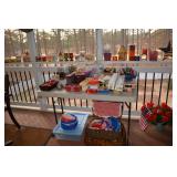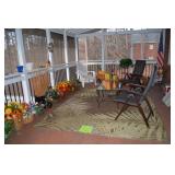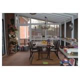 Screened In Porch: Table with 4 Chairs, Pair of Folding Chairs, Candles, Lots of Floral Arrangements, Baker’s Rack, Outdoor Planters and Accessories, and More.