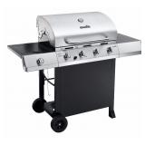Char-Broil 463439915 Traditional 4-Burner Gas Grill. Char-Broil 4-burner, 40,000 BTU gas grill with 10,000 BTU lidded side burner 480 square inches of primary cooking on porcelain-coated cast iron grates plus 180 square inches of secondary cooking on porcelain-coated swing away Large, painted metal side shelves offer additional workspace Stainless steel lid, handle, control panel, and fascia add style and durability Electronic ignition system offers a reliable spark with every push Item is in factory carton! Retail $255.02 |