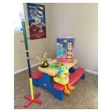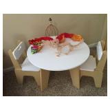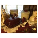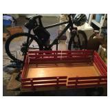 Wood red wagon, bicycle, flower pots, work bench, garage stuff