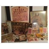 Tobacco tin tags, tobacco jar, tobacco cigar scraps, cuttings advertising bags, metal signs, tablets, posters, cigarette ads