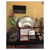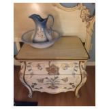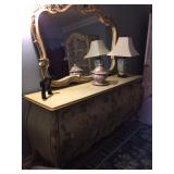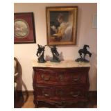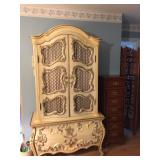 victorian corner floor cabinet, Painted French Bedroom with wardrobe, dresser & mirror, dressing table, king bed frame, 2 bedside commodes, bear holding glass top coffee table, 4 dr file cabinet, small dressing table, 5 drawer white chest, pet stool, pair French chairs with cane, pair Louis XVI style 3 drawer side table with gilt bronze mounts, Louis XV kidney shape side table, pair balloon back chairs, small Louis XV side table, painted French secretary bookcase, white Duncan Phyfe style secretary bookcase, trundle bed, solid wood chest, Star furniture pair Louie XV style chairs with ottomans, Gun Case, Queen Anne wing back chair, Duncan Phyfe 4 drawer chest, chaise lounge, 4 drawer wood chest, carved Asian wood floor screen, 7 drawer lingerie chest, vanity stools, dinning room table with 6 chairs, lighted curio cabinet, small ladies secretary desk with wood inlay design, drop leaf table, 2 trundle beds C M Russell bronze, Cheyenne by Frederic Remington, Stagecoach by C M Russell, Mountain Man by Remington, End of Trail by Fraser 2 Irish maps; Lands of Balrenny , County of Meath 1869 & 1872 Killingcarrig Sterling Silver Steuben Glass Oil on canvas portrait by Michael J Allard Appliances: French door refrigerator, side by side refrigerator, washer, dryer Wash bowl & pitcher set, books on many subjects, Wall mount TV, Chinese Netsuke figures, wool rugs (many different sizes), lamps. Chinese figure floor rug, Asian spice cabinet, CD's, mirrors, framed art works, Sony boom box, linens, fabrics, several sets of dishes, Portugal pottery, small kitchen appliances, 2 wine racks, glassware and dishes for entertaining, silverplate hanging shoe racks, 2 closet shelves, Ladies clothes small 2-6 Garage has tools: Black & Decker Workmate, nuts, bolts & screws, hand tools, golf clubs, New in box Masterbuilt Smokehouse, coolers, motor oil, pesticides, paint, lumber, child gates, 2 antique transit sets