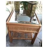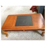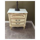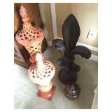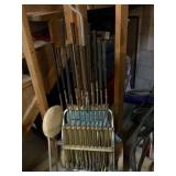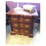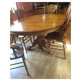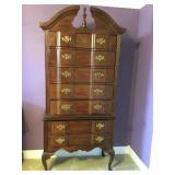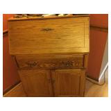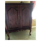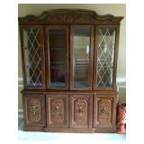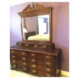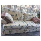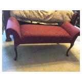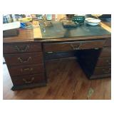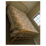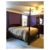 Furniture: Mahogany queen size poster bed with mattress, mahogany dresser, highboy, pair of matching nightstands Slant front desk Upholstered bench with curved ends Vintage iron full size bed with mattress Small pine painted coffee table La-Z-Boy brown love seat Pair of French provincial nightstands Executive kneehole desk and Office chair Pair of wicker chairs and matching round table Green storage bench TV cabinet Display coffee table, sofa table, and end table Amoire-small on turned legs China cabinet Round oak pedestal table, large leaf, six press back tall chairs Floral sunroom sofa Three odd end tables Rattan/glass end table Dark red recliner