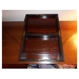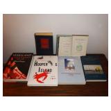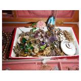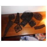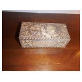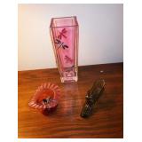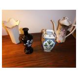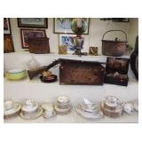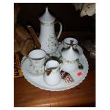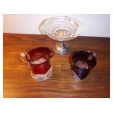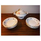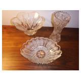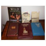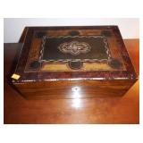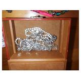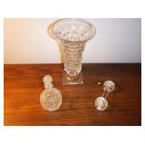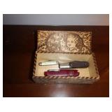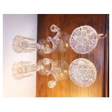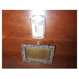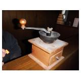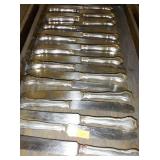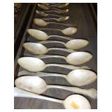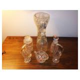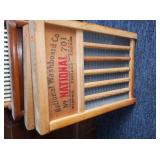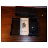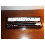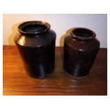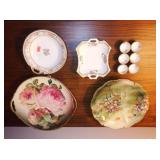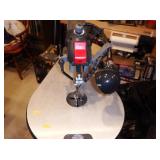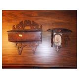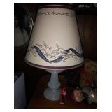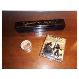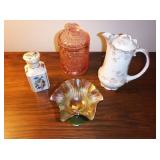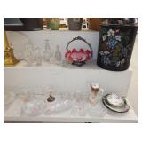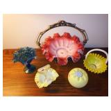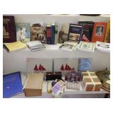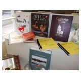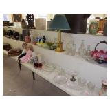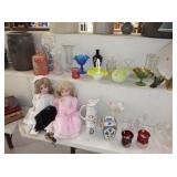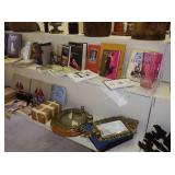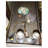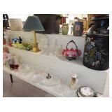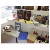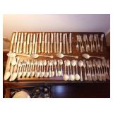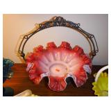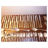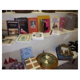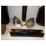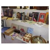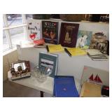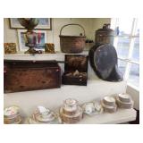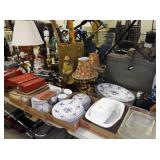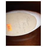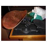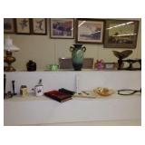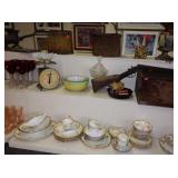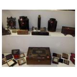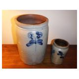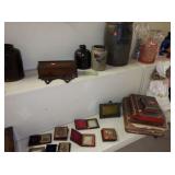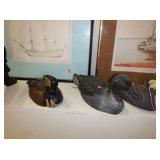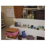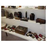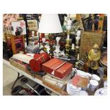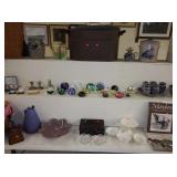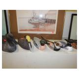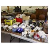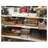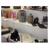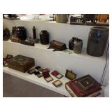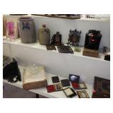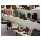Primitives/Collectables: (5:15PM): Pr of Oliver Lawson Duck House miniature Pintails hen and drake, 50pcs of Whiting sterling monogrammed flatware, 19th Cent MOP inlaid desk lap desk, beautiful Victorian ruffled brides basket w/ plated silver handled carrier, French sterling silver hand painted dresser mirror, mini stoneware blue and gray decorated crock, stoneware handled one gallon whiskey jug, Blue and Gray decorated 3 gallon stoneware whiskey jug, Antique Fairbanks countertop cast iron store scale, (2) Roseville Donatello vases, Roseville vase, primitive split Oak basket, floral double globe lamp, primitive ice tongs, primitive coal heater, vintage cider jug, Pr of Cambridge glass candleobras, Cambride glass centerbowl and candlesticks, LG Qty of costume jewelry, LG Qty of local books, Pr boudoir lamps, blown vinegar cruets, vintage kitchen canisters, antique double tree, Towle decorated milk can, vintage milk cans, vintage print block drawer, primitive wash boards, art glass paperweight collection and more!