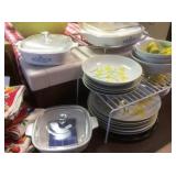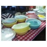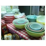 KITCHEN · Corelle set of dishes · Corning serving dishes · Vintage kitchen items · Pyrex; 2 sets of 4 piece nesting bowls in primary colors · Pyrex bowls with handles plus more in colors yellow, pink, brown, peach · Cookie jar collection · Pots and pans · Flat ware · Glass ware · Microwave oven