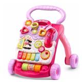 VTech Sit-to-Stand Learning Walker - Pink. Interactive learning baby walker features a removable toddler play panel that develops fine motor skills. Adjustable speed control on wheels Early learning center has 5 piano keys that play musical notes and encourage creativity; wheels work on carpeted and hard floors Features 2 colorful spinning rollers, 3 shape sorters, and 3 light-up buttons that develop motor skills Pretend telephone handset and mechanical elements enhance role-play fun; 2 AA batteries are included Over 70 sing-along songs, music, sound effects and fun phrases; intended for babies and toddlers from 9 months to 3 years old. In factory packaging. See at the preview. Retail price $28.68 |