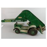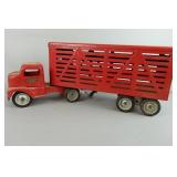 Tin key wind “Trolley” Toonerville 1922 Fontaine Fox, Tonga livestock hauler, Dieppe Model Toys Barber green truck, Nylint Adams Travel Loader, Plastic Hubley Kiddie Toy with original box, Smith Toys dumb truck, vintage tin car