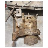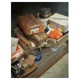 Antique and collectible items: Nabisco advertising metal shelf on wheels Antique corn shucker Antique Beaver pipe threader 2 lanterns