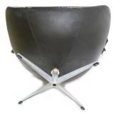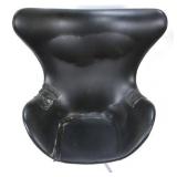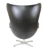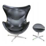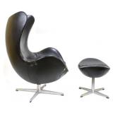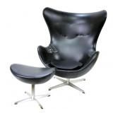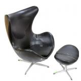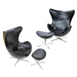 Lot 2. Arne Jacobsen for Fritz Hansen Model 3316 Egg Lounge Chairs; 20th Century; matching pair to include; (2) lounge chairs measuring 41.5 inches height, 35 inches length across top, 32 inches width across arms, approx. 29 inches depth; both have original cushions and original leatherette black upholstery; matching pair of ottomans measuring 17 x 22 x 16 inches; all pieces have aluminum four prong spider bases, both chair has original foil titled Made In Denmark by Fritz Hansen with Danish Furniture Maker Control, both chairs have damage to arm rest, seat cushions, and seam underneath cushion, one ottoman has ripped leather, the other ottoman has small half inch split, needs to be professionally reupholstered otherwise excellent condition and structurally sound; Provenance: Private Coastal Carolina Collection