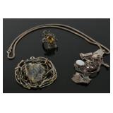 Lot 38. Mid Century Jewelry Group Lot; 20th Century; group of (3) to include: sterling silver organic form ring with yellow stone, unmarked pendant with freeform wire and geode, sterling silver rope necklace and pendant with artist signed JEM abstract pendant with opal, overall excellent condition; Provenance: Private Chapel Hill NC Collection