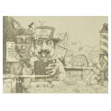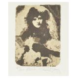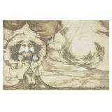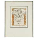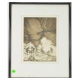 Lot 45. Charlie Bragg Etching; 20th Century; 13 inches x 10 inches; pencil signed 21/150, titled The Almighty Fiend, depicting man holding doll, snake, and hour glass in thunderstorm, professionally framed and matted, overall excellent condition; Provenance: Private Yadkinville NC Collection