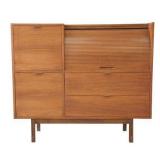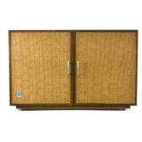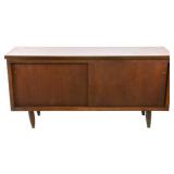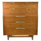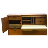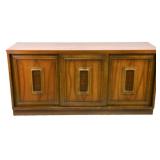 Lot 31. Lane Mid Century Two Piece Hutch; 20th Century; 72 inches height, 66 inches length, 19 inches depth; solid walnut, two piece; top half has two doors with china cabinet center above three drawers, missing glass doors, base has three drawers in center with storage cabinets flanking either side, heavy scratches and scuffs on base otherwise excellent; Provenance: Recently Discovered by NC Picker