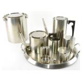 Lot 8. Arne Jacobsen for Lauffer Stelton Denmark Stainless Cylinda Line Tea Set and Ice Bucket; 20th Century; (9) pieces to include: 8.25 inch ice bucket with lid, 8 inch coffee pot with lid, 5.25 inch tea pot with lid, 3.75 inch creamer, 3.75 inch sugar, 2.25 inch sugar, pair of 2.25 inch salt and pepper shaker, 3.5 inch tea strainer, also included in this lot is a 16 inch stainless steel Belgium Made Demeyere platter with handles, all pieces have light scratches from use otherwise excellent condition; Provenance: Private Pinehurst NC Collection