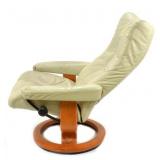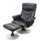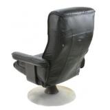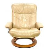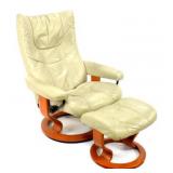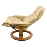 Lot 14. Ekornes Stressless Leather Lounge Chair; 20th Century; 41 inches height, 30 inches width, 44 inches depth when reclined; ottoman measures 16 inches height, 19 inches width, 16 inches depth, Norwegian leather recliner with matching ottoman, bentwood bases, leather is worn and cracked on arm rest, leather on ottoman is worn and cracked, recliner in working condition otherwise good; Provenance: Private Lake Gaston Collection