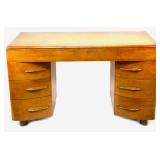 Lot 28. Heywood Wakefield Encore Kneehole Desk; 20th Century; 30.5 inches height, 49.5 inches length, 24 inches depth; has champagne finish, one large drawer above, two sets of three curved inside radius drawers, original upholstered chair measures 34 inches height, 17 width, 22 inches depth, appears to be original wool upholstery, desk has faded finish and light scratches from use otherwise good condition; Provenance: Private Coastal Carolina Collection