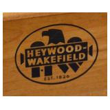Lot 30. Heywood Wakefield Dining Chairs; 20th Century; set of (8); 33 inches height, 18 inches width, 19 inches depth; solid maple construction, reupholstered seats, plastic swivel feet, all chairs marked with Heywood Wakefield brand, some chairs have slight fading to finish, light scratches from use otherwise excellent; Provenance: Private Raleigh NC Collection