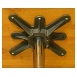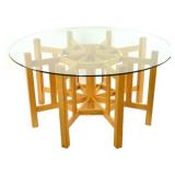 Lot 63. Art’s and Crafts Style Water Wheel Dining Table; 20th Century; 30 inches height, 60 inches diameter; gold oak construction with eight spokes, in the form of water or paddle wheel fretwork, has round glass top, overall excellent original condition; Provenance; Private Lake Gaston Collection