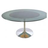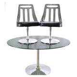 Lot 65. Chrome Glass Lucite Tulip Dining Table and Chairs; 20th Century; dining table measures 30 inches height, 60 inches length, 46 inches depth; has chrome base with leather pad and smoke glass oval top; matching pair of chairs measure 30 x 20 x 18 inches; chrome bases with leather seats with smoked Lucite back rest, scratches throughout on glass, chrome, and Lucite otherwise excellent condition; Provenance: Private Lake Gaston NC Collection