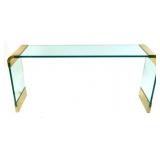 Lot 64. Italian Brass and Glass Console Table; 20th Century; 27 inches height, 58 inches length, 15 inches depth; polished brass mounts and feet with one inch beveled tempered glass, one leg has small chip where glass meets brass foot, top glass has small chip under brass mount, light scratches to glass surface otherwise excellent condition; Provenance: Private Pinehurst NC Collection