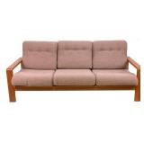 Lot 32. Mid Century Modern Gondola Sofa and Chair; 20th Century; matching pair sofa and chair; sofa measures 30 inches height, 90 inches length, 29 inches depth; chair measures 32 inches height, 42 inches length, 30 inches depth; Adrian Pearsall style with walnut feet and walnut gondola panel in front, green wool upholstery, light fading on one arm of sofa with scuff to gondola strip otherwise excellent condition; Provenance: Recently Discovered by VA Picker