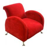 Lot 47. Art Deco Style Red Velvet Chair; 20th Century; 31 inches height, 33 inches width, 39 inches depth; contemporary art deco style plush red velvet lounge chair with chrome ice cream scoop feet, overall excellent condition; Provenance: Private Hillsborough NC Collection