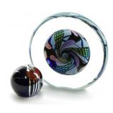 Lot 77. Studio Art Glass Paper Weight Group; 20th Century; group of (2) to include: 6 inch diameter, iridescent globule incased in oval shape, displays two ways hand signed McDonald; 2.5 inch paper weight depicting sun set, and birds; hand signed and numbered 2856, overall excellent condition; Provenance: Private Hillsborough NC Collection