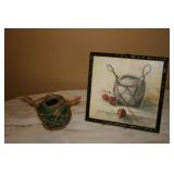 Antique Asian vase w/ original pencil drawn art piece in bamboo frame |