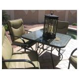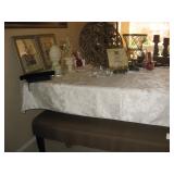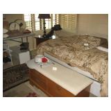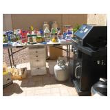 To highlight - Leather sofa; patio heater; dinette set; queen mattress set with frame; Patio pub set; love seat; side tables; patio furniture; upholstered cedar chest; women clothing; BBQ; upholstered bench; tools; yard tools; sofa table; lamps; ladder; nightstands; wine rack; home decor; framed art and HH (household) items. |
