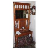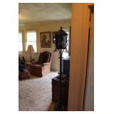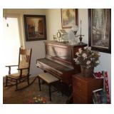 Upright Piano E. Rushworth 13. Islinton Liverpool with magnificent burl walnut cabinet. Whit Session mantle clock, ooc by F. Holzer plus several other nice oils, Vintage 1940’s lift top desk, Brass student lamp, Oak coffee table, Antique Oak hall Tree, Oak Antique bookcase, Vintage 1920’s carved bed, Carved lamp tables, Antique 3 drawer chest, Rare Antique Walnut drop front desk, cedar chest, plant stands.Linen cabinet, Oak legal book case with leaded glass door, Howard Miller grandfather clock, Antique AtwaterKent radio cabinet only, Two old trunks, Antique wall clock and mantle clock, Vintage horse tricycle, Old rockers, 2 Refrigerators, Washer and Dryer, Pine cabinet, Antique dining set, Sofa Bed, and Lrg, living room sofa. lots of kitchen items dishes appliances, linens, Vintage Magazine stands, Nice old porcelain percolator, Aprox 65 pieces of International sterling silver ‘ Spring Glory pattern’ plus jewelry.