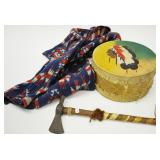 Indian Decorated Drum, Hatchet and Child's Jacket |