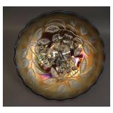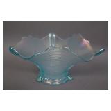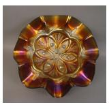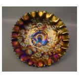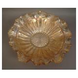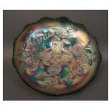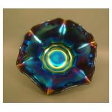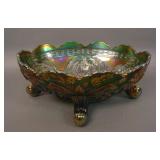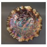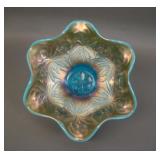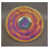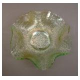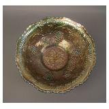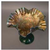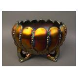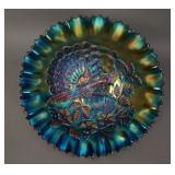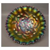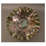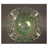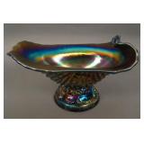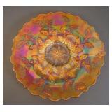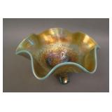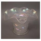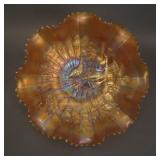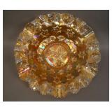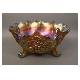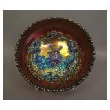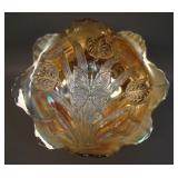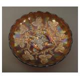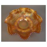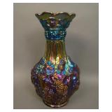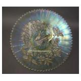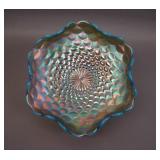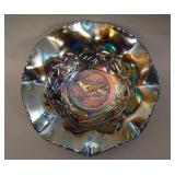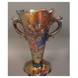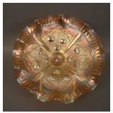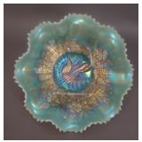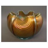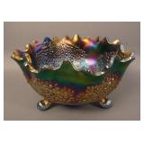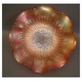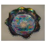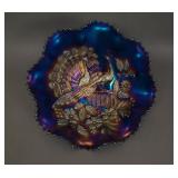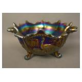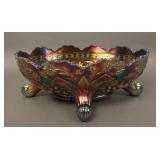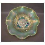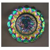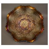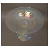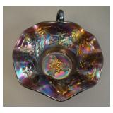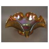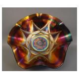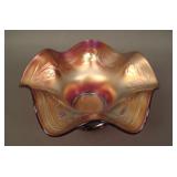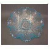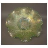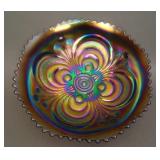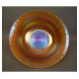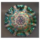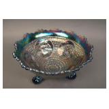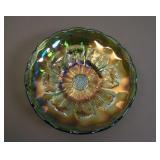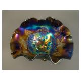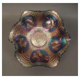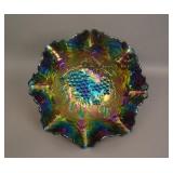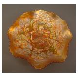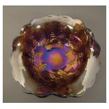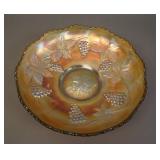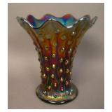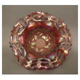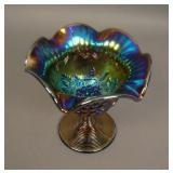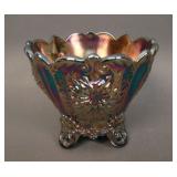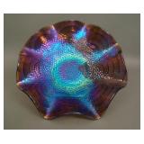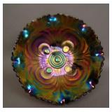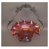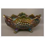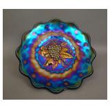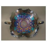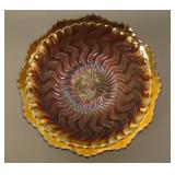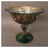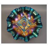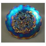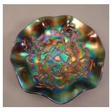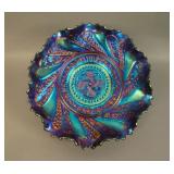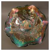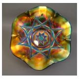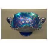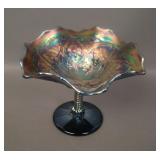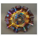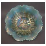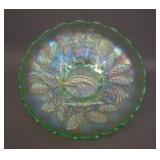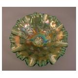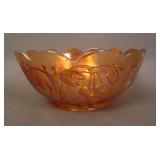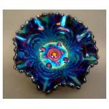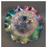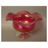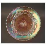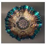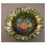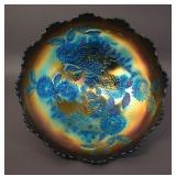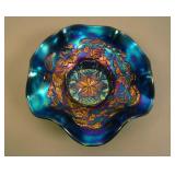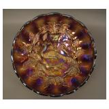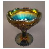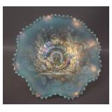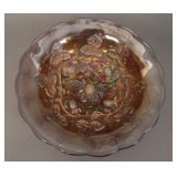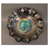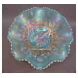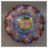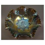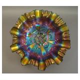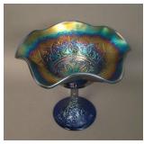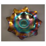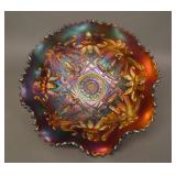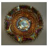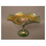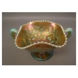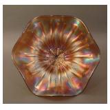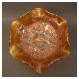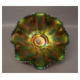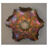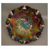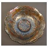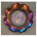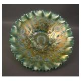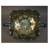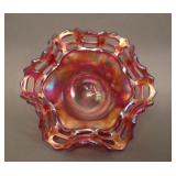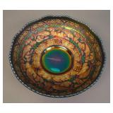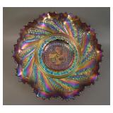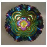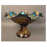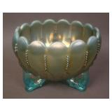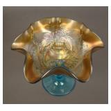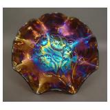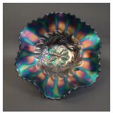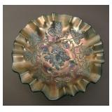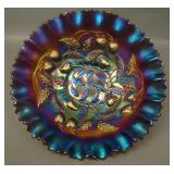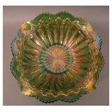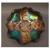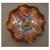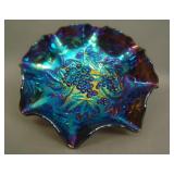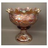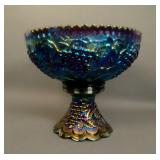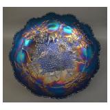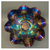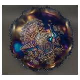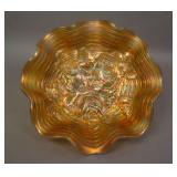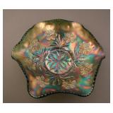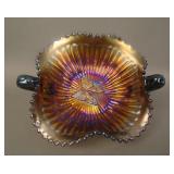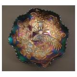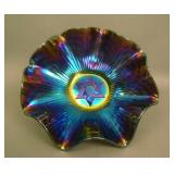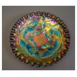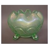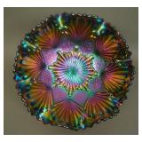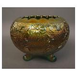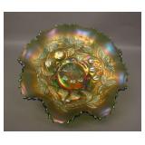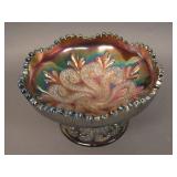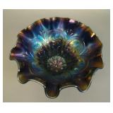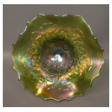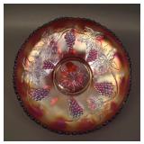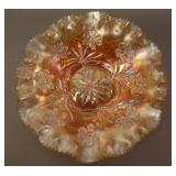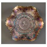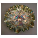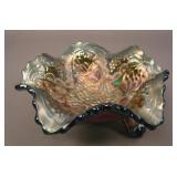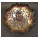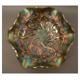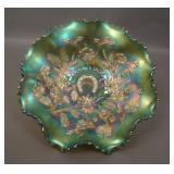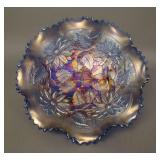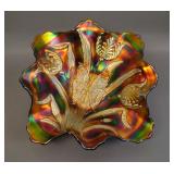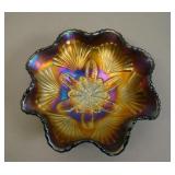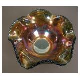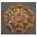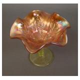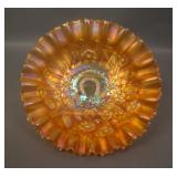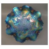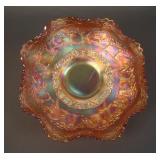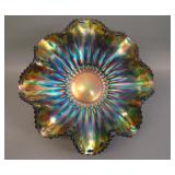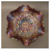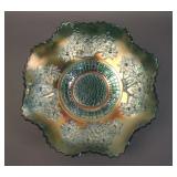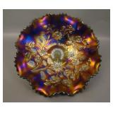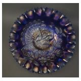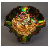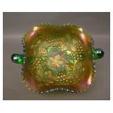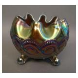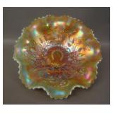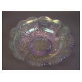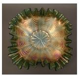 1 10” Tall Possinger Lg. 6 Ruffled Vase – Red (nice color w/ excellent irid.) 2 6 ¼” Tall Possinger ftd. 6 Ruffled Vase or Rose Bowl – Red (on a crystal frosted base; unusual) 3 4 ¼” Tall x 5 ¼” Diameter European Pinwheel ftd. Round Compote – Dk. Mari. (scarce item) 4 5” Tall Eda Curved Star ftd. 10 Ruffled Compote w/ Headdress Int. – Blue (very scarce color for this pattern) 5 Sowerby Diving Dolphin 3 ftd. Round Flared Compote w/ Embossed Scroll Int. – Aqua (extremely rare color for this scarce item) 6 Sowerby Covered Hen on the Nest Butter Dish – Blue (very scarce; nice) 7 9 ½” Australian Kingfisher Lg. 10 Ruffled Bowl – Purple (very scarce; really nice color & irid.) 8 5 ¾” Australian Magpie Small 8 Ruffled Sauce – Purple (scarce; nice color) 9 (2) European Ranger Perfume Bottles & Stoppers, and (1) Cologne Bottle & Stopper – Dk. Mari. (selling all 3 in one lot; great color and irid.) 10 9 ¾” Imperial Brocaded Daffodil 4 ftd. 8 Sided Center Bowl – Red (extremely rare item in a really rare color) 11 6” x 7 ½” Imperial Brocaded Summer Garden Stemmed Round Compote – Clear/ Irid. (scarce; nice irid.) 12 8 ½” x 5 ¾” Tall Fostoria Brocaded Acorn Lg. Bulbous Vase – Lavender (rare color; very desirable) 13 6 7/8” Fostoria Brocaded Palms 2-Sided Handled Bon Bon – Ice Green (nice irid.) 14 (Maker)? Intaglio Two Fruits Deep Round Bowl – Mari. (scarce; nice irid.) 15 U.S. Glass Cosmos and Cane individual Breakfast Open Sugar and Creamer – White (very rare pair; one has epoxy) 16 8 ¾” Jenkins Field Thistle Swung Vase – Mari. (very scarce pattern; nice size and color) 17 10” Diamond Glass Company Lustre & Clear Lg. I.C. Bowl – Red w/ white trim (scarce; nice) 18 10 3/8” Vineland Glass Company Stretch Lg. 6 Ruffled Bowl – Lavender (nice color) 19 (2) 4 1/6 – ¾” Cambridge Inverted Strawberry ind. Round Berry Bowls – Amethyst (selling as a pair) 20 Cambridge Venetian Giant ftd. Rose Bowl – Green (rare & very desirable; really nice color) 21 Pair Cambridge Inverted Strawberry Candlesticks – Green (scarce pair; both have some damage to base) 22 Cambridge Inverted Strawberry Covered Powder Jar – Green (scarce; nice) 23 6 ½” Cambridge Inverted Strawberry Round Bowl – Green (nice irid.) 24 8 ¼” Cambridge Inverted Strawberry Deep Round Bowl – Amethyst (very scarce size) 25 Cambridge Inverted Thistle Handled Covered Sugar Bowl – Amethyst (rare item; has damage to the finial) 26 Cambridge Inverted Feather Handled Covered Cracker Jar – Green (scarce; nice) 27 Cambridge Small-Size Buzz Saw Cruet w/ no stopper – Green (nice color) 28 M’burg Swirl Hobnail Rose Bowl – Purple (scarce; average irid.) 29 M’burg Peacock Tail Variant Stemmed 6 Ruffled Compote – Amethyst (satiny; perfect) 30 M’burg Marilyn 7 pc. Water Set – Amethyst (rare set that is well matched; really nice irid.) 31 7 ½” M’burg Blackberry Wreath 6 Ruffled Bowl – Amethyst (radium & nice) 32 8 ½” M’burg Blackberry Wreath Round Flared Bowl – Amethyst (radium & nice) 33 8 7/8” M’burg Blackberry Wreath 6 Ruffled Bowl – Green (radium irid.) 34 10 ¼” M’burg Blackberry Wreath Lg. Bowl w/ 3 in 1 Edge – Green (satiny finish) 35 9 ¾” M’burg Blackberry Wreath Lg. Ice Cream Bowl – Amethyst (radium & really nice) 36 7 ¾” M’burg Holly Sprig Tri-Cornered Bowl – Amethyst (scarce item; has a couple flakes) 37 10” M’burg Holly Whirl Lg. 6 Ruffled Bowl – Amethyst (nice color) 38 10 ½” M’burg Rosalind Lg. 6 Ruffled Bowl – Amethyst (really nice example w/ excellent irid.) 40 8 5/8” x 8 5/8” M’burg Rays and Ribbons 4-Sided Square Bowl – Green (very rare and very desirable shape; great radium finish) 41 9 5/8” M’burg Rays and Ribbons 6 Ruffled Crimped Edge Bowl – Amethyst (nice color) 42 9” M’burg Zig Zag Round Flared Bowl – Amethyst (very scarce pattern; really nice irid.) 43 8 ½” M’burg Big Fish Bowl w/ 3 in 1 Edge – Dk. Mari. (rare and very desirable; has a radium finish) 44 8 1/8” M’burg Trout and Fly Bowl w/ 3 in 1 Edge – Amethyst (really desirable; nice) 45 9 ½” M’burg Whirling Leaves Tri-Cornered Crimped Edge Bowl – Green (radium and very desirable; nice example) 46 9 ¼” M’burg Strawberry Wreath Lg. 6 Ruffled Crimped Edge Bowl – Green (extreme radium irid. and really desirable; nice) 47 8 ½” M’burg Grape Wreath Variant low 6 Ruffled Bowl – Green (radium & nice) 48 8 3/8” M’burg Grape Wreath Variant Bowl w/ 3 in 1 Edge – Green (radium finish) 49 8” M’burg Grape Wreath Variant Bowl w/ 3 in 1 Edge – Amethyst (radium; really nice) 50 9 ½’ M’burg Peacocks Lg. Ice Cream Shaped Bowl – Amethyst (very desirable w/ nice radium irid.) 51 9 5/8” M’burg Peacocks Lg. 6 Ruffled Bowl – Green (another radium example; nice ) 52 M’burg Peacocks 7 pc. Flared Berry Set – Amethyst (rare & desirable set; all radium; damage on master) 53 9 ¼” M’burg Peacocks Lg. Round Flared Master Berry Bowl – Amethyst (flaked on edge) 54 10 3/8” M’burg Peacock at the Urn Lg. 6 Ruffled Bowl – Mari. (has bee; no beading; really nice satiny finish) 55 9” M’burg Nesting Swan Lg. 6 Ruffled Bowl – Green (nice radium finish) 56 10” M’burg Nesting Swan Lg. 6 Ruffled Bowl – Green (satiny example) 57 9 ½” M’burg Nesting Swan Lg. 6 Ruffled Bowl – Amethyst (radium & nice) 58 10” M’burg Primrose Lg. 6 Ruffled Bowl – Green (satiny example) 59 10” M’burg Primrose Lg. 6 Ruffled Bowl w/ 3 in 1 Edge – Mari. (satiny example) 60 10 ½” M’burg Seaweed Lg. 6 Ruffled Bowl – Green (rare and desirable; nice satiny example) 61 10 ¼” M’burg Seaweed Lg. 6 Ruffled Bowl w/ 3 in 1 Edge – Mari. (very desirable w/ a nice satiny finish) 62 9 3/8” M’burg Fleur de Lis domed 6 Ruffled Crimped Edge Bowl – Mari. (excellent radium example; really nice) 63 9 5/8” M’burg Whirling Leaves low 6 Ruffled Bowl – Mari. (radium & nice
