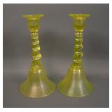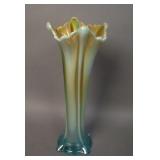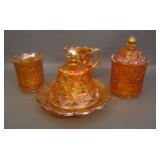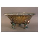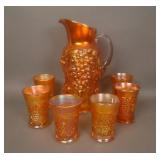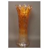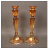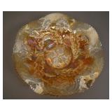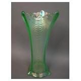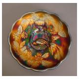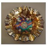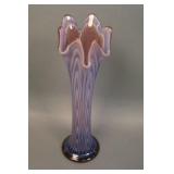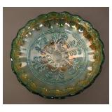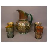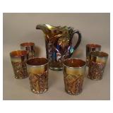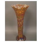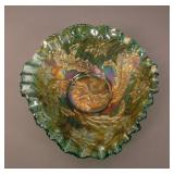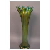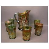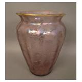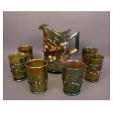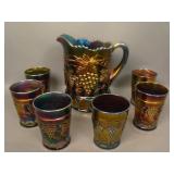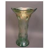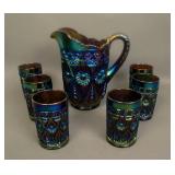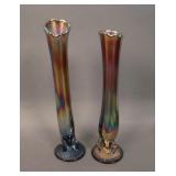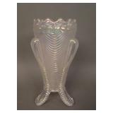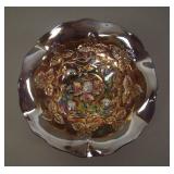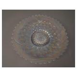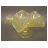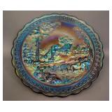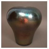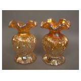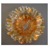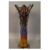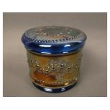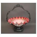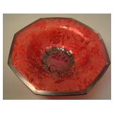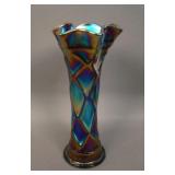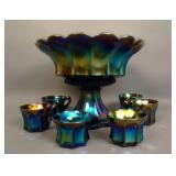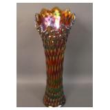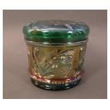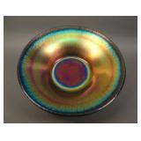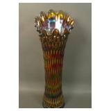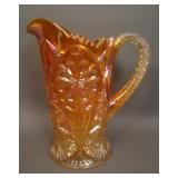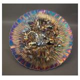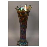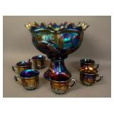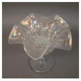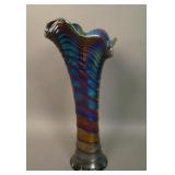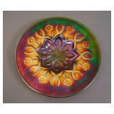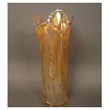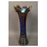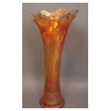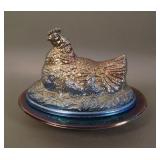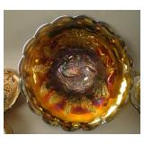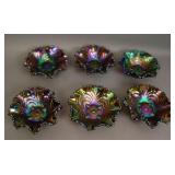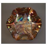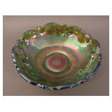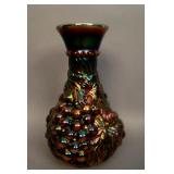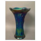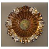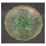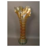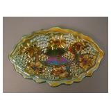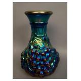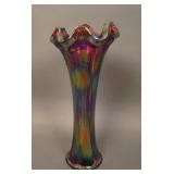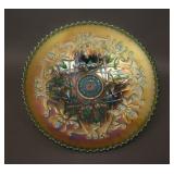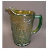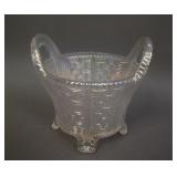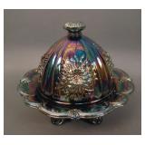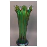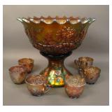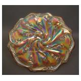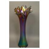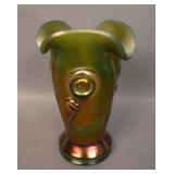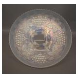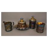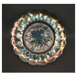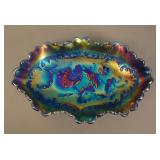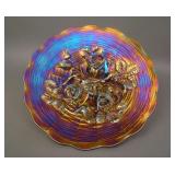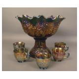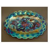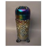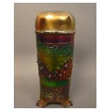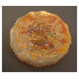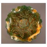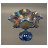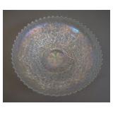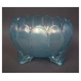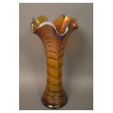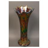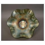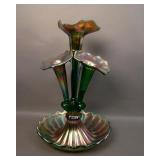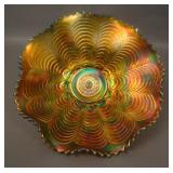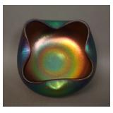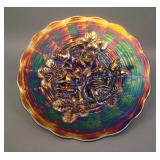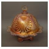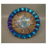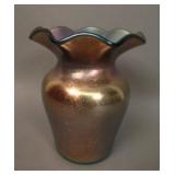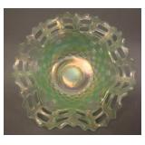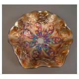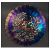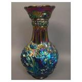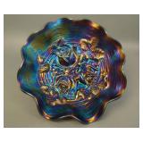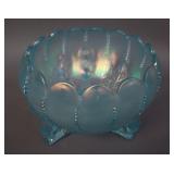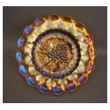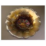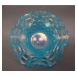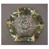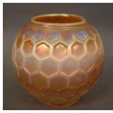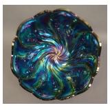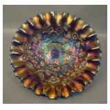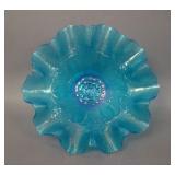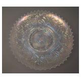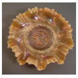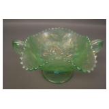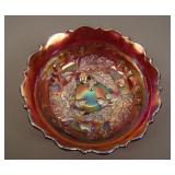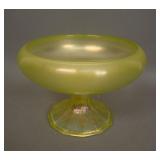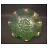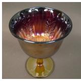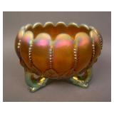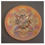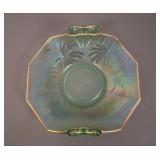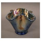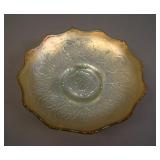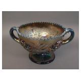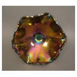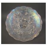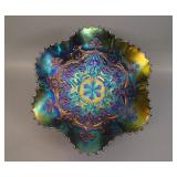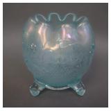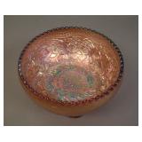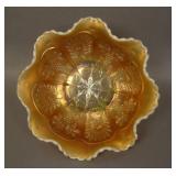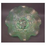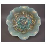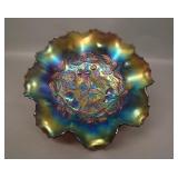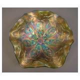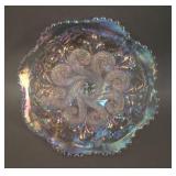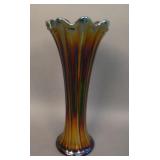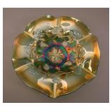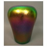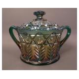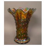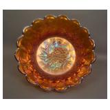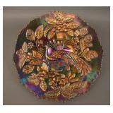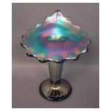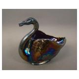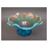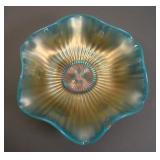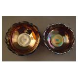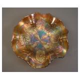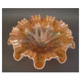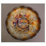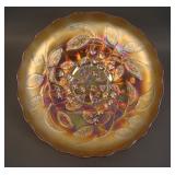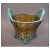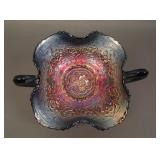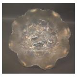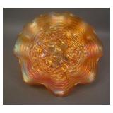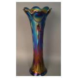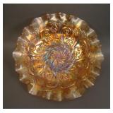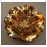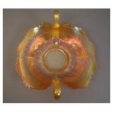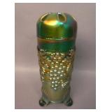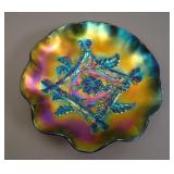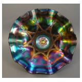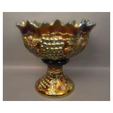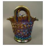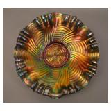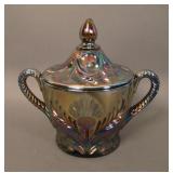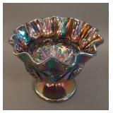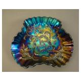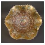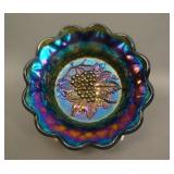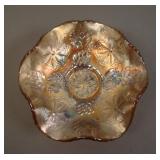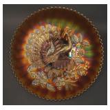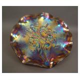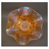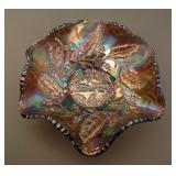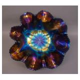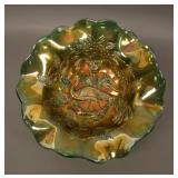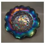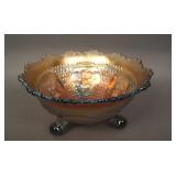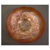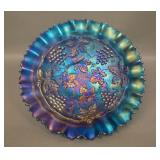 1 10” Tall Possinger Lg. 6 Ruffled Vase – Red (nice color w/ excellent irid.) 2 6 ¼” Tall Possinger ftd. 6 Ruffled Vase or Rose Bowl – Red (on a crystal frosted base; unusual) 3 4 ¼” Tall x 5 ¼” Diameter European Pinwheel ftd. Round Compote – Dk. Mari. (scarce item) 4 5” Tall Eda Curved Star ftd. 10 Ruffled Compote w/ Headdress Int. – Blue (very scarce color for this pattern) 5 Sowerby Diving Dolphin 3 ftd. Round Flared Compote w/ Embossed Scroll Int. – Aqua (extremely rare color for this scarce item) 6 Sowerby Covered Hen on the Nest Butter Dish – Blue (very scarce; nice) 7 9 ½” Australian Kingfisher Lg. 10 Ruffled Bowl – Purple (very scarce; really nice color & irid.) 8 5 ¾” Australian Magpie Small 8 Ruffled Sauce – Purple (scarce; nice color) 9 (2) European Ranger Perfume Bottles & Stoppers, and (1) Cologne Bottle & Stopper – Dk. Mari. (selling all 3 in one lot; great color and irid.) 10 9 ¾” Imperial Brocaded Daffodil 4 ftd. 8 Sided Center Bowl – Red (extremely rare item in a really rare color) 11 6” x 7 ½” Imperial Brocaded Summer Garden Stemmed Round Compote – Clear/ Irid. (scarce; nice irid.) 12 8 ½” x 5 ¾” Tall Fostoria Brocaded Acorn Lg. Bulbous Vase – Lavender (rare color; very desirable) 13 6 7/8” Fostoria Brocaded Palms 2-Sided Handled Bon Bon – Ice Green (nice irid.) 14 (Maker)? Intaglio Two Fruits Deep Round Bowl – Mari. (scarce; nice irid.) 15 U.S. Glass Cosmos and Cane individual Breakfast Open Sugar and Creamer – White (very rare pair; one has epoxy) 16 8 ¾” Jenkins Field Thistle Swung Vase – Mari. (very scarce pattern; nice size and color) 17 10” Diamond Glass Company Lustre & Clear Lg. I.C. Bowl – Red w/ white trim (scarce; nice) 18 10 3/8” Vineland Glass Company Stretch Lg. 6 Ruffled Bowl – Lavender (nice color) 19 (2) 4 1/6 – ¾” Cambridge Inverted Strawberry ind. Round Berry Bowls – Amethyst (selling as a pair) 20 Cambridge Venetian Giant ftd. Rose Bowl – Green (rare & very desirable; really nice color) 21 Pair Cambridge Inverted Strawberry Candlesticks – Green (scarce pair; both have some damage to base) 22 Cambridge Inverted Strawberry Covered Powder Jar – Green (scarce; nice) 23 6 ½” Cambridge Inverted Strawberry Round Bowl – Green (nice irid.) 24 8 ¼” Cambridge Inverted Strawberry Deep Round Bowl – Amethyst (very scarce size) 25 Cambridge Inverted Thistle Handled Covered Sugar Bowl – Amethyst (rare item; has damage to the finial) 26 Cambridge Inverted Feather Handled Covered Cracker Jar – Green (scarce; nice) 27 Cambridge Small-Size Buzz Saw Cruet w/ no stopper – Green (nice color) 28 M’burg Swirl Hobnail Rose Bowl – Purple (scarce; average irid.) 29 M’burg Peacock Tail Variant Stemmed 6 Ruffled Compote – Amethyst (satiny; perfect) 30 M’burg Marilyn 7 pc. Water Set – Amethyst (rare set that is well matched; really nice irid.) 31 7 ½” M’burg Blackberry Wreath 6 Ruffled Bowl – Amethyst (radium & nice) 32 8 ½” M’burg Blackberry Wreath Round Flared Bowl – Amethyst (radium & nice) 33 8 7/8” M’burg Blackberry Wreath 6 Ruffled Bowl – Green (radium irid.) 34 10 ¼” M’burg Blackberry Wreath Lg. Bowl w/ 3 in 1 Edge – Green (satiny finish) 35 9 ¾” M’burg Blackberry Wreath Lg. Ice Cream Bowl – Amethyst (radium & really nice) 36 7 ¾” M’burg Holly Sprig Tri-Cornered Bowl – Amethyst (scarce item; has a couple flakes) 37 10” M’burg Holly Whirl Lg. 6 Ruffled Bowl – Amethyst (nice color) 38 10 ½” M’burg Rosalind Lg. 6 Ruffled Bowl – Amethyst (really nice example w/ excellent irid.) 40 8 5/8” x 8 5/8” M’burg Rays and Ribbons 4-Sided Square Bowl – Green (very rare and very desirable shape; great radium finish) 41 9 5/8” M’burg Rays and Ribbons 6 Ruffled Crimped Edge Bowl – Amethyst (nice color) 42 9” M’burg Zig Zag Round Flared Bowl – Amethyst (very scarce pattern; really nice irid.) 43 8 ½” M’burg Big Fish Bowl w/ 3 in 1 Edge – Dk. Mari. (rare and very desirable; has a radium finish) 44 8 1/8” M’burg Trout and Fly Bowl w/ 3 in 1 Edge – Amethyst (really desirable; nice) 45 9 ½” M’burg Whirling Leaves Tri-Cornered Crimped Edge Bowl – Green (radium and very desirable; nice example) 46 9 ¼” M’burg Strawberry Wreath Lg. 6 Ruffled Crimped Edge Bowl – Green (extreme radium irid. and really desirable; nice) 47 8 ½” M’burg Grape Wreath Variant low 6 Ruffled Bowl – Green (radium & nice) 48 8 3/8” M’burg Grape Wreath Variant Bowl w/ 3 in 1 Edge – Green (radium finish) 49 8” M’burg Grape Wreath Variant Bowl w/ 3 in 1 Edge – Amethyst (radium; really nice) 50 9 ½’ M’burg Peacocks Lg. Ice Cream Shaped Bowl – Amethyst (very desirable w/ nice radium irid.) 51 9 5/8” M’burg Peacocks Lg. 6 Ruffled Bowl – Green (another radium example; nice ) 52 M’burg Peacocks 7 pc. Flared Berry Set – Amethyst (rare & desirable set; all radium; damage on master) 53 9 ¼” M’burg Peacocks Lg. Round Flared Master Berry Bowl – Amethyst (flaked on edge) 54 10 3/8” M’burg Peacock at the Urn Lg. 6 Ruffled Bowl – Mari. (has bee; no beading; really nice satiny finish) 55 9” M’burg Nesting Swan Lg. 6 Ruffled Bowl – Green (nice radium finish) 56 10” M’burg Nesting Swan Lg. 6 Ruffled Bowl – Green (satiny example) 57 9 ½” M’burg Nesting Swan Lg. 6 Ruffled Bowl – Amethyst (radium & nice) 58 10” M’burg Primrose Lg. 6 Ruffled Bowl – Green (satiny example) 59 10” M’burg Primrose Lg. 6 Ruffled Bowl w/ 3 in 1 Edge – Mari. (satiny example) 60 10 ½” M’burg Seaweed Lg. 6 Ruffled Bowl – Green (rare and desirable; nice satiny example) 61 10 ¼” M’burg Seaweed Lg. 6 Ruffled Bowl w/ 3 in 1 Edge – Mari. (very desirable w/ a nice satiny finish) 62 9 3/8” M’burg Fleur de Lis domed 6 Ruffled Crimped Edge Bowl – Mari. (excellent radium example; really nice) 63 9 5/8” M’burg Whirling Leaves low 6 Ruffled Bowl – Mari. (radium & nice