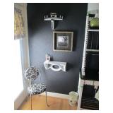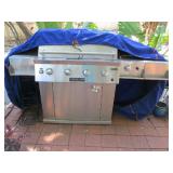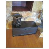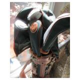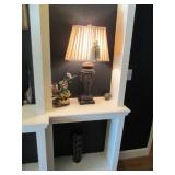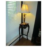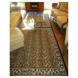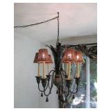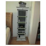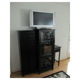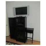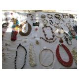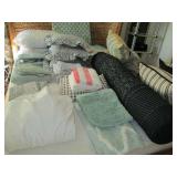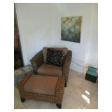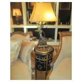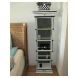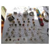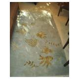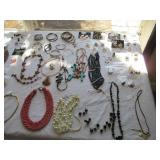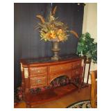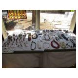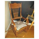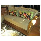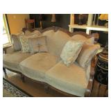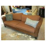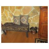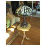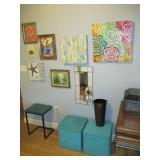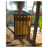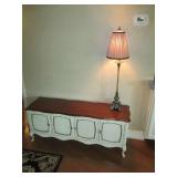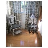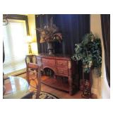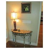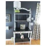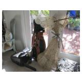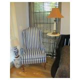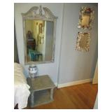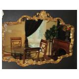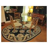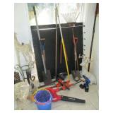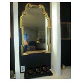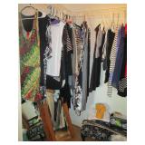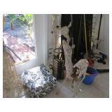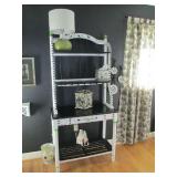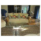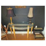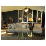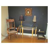 Park Lane Jewelry, sofa & chair, wicker sofa & chair, standing cupboard, modern glass half round table, glass coffee table, painted tables & cabinets, lots of area rugs, a variety of mirrors, bench with woven frame, a lot of lamps, lady's clothes & accessories, small dining set, server, leaded glass window, étagère, wing chair, oak antique rocker, Tiffany style lamp, Fire King 4 drawer fire proof file cabinet, Jenn-Aire grill, golf clubs, Kitchenaid mixer, linens, kitchenware & yard tools.