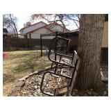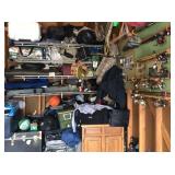 Outdoor pergola Large fabric sectional Dining table with 6 chairs Dressers, chest, beds and end tables Asian Art Theater seating Bar cabinet Bar shelves Bar stools Desk Storage cabinets Camping gear Rifles, Remington with scope Hunting gear Yard tools