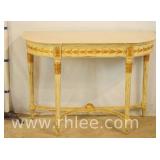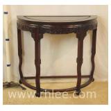 Carved Oriental style half round console table with stretcher base; 68-958 - (stretcher is broken behind front leg) - 37x19x33.5