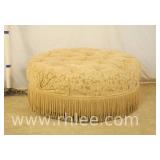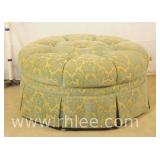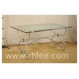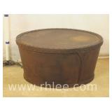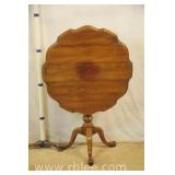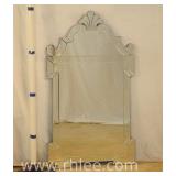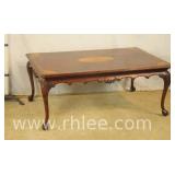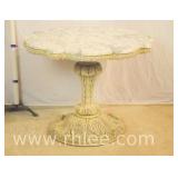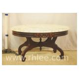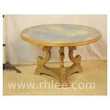 Round coffee table with carved base and decorated mirror top ; 68-893