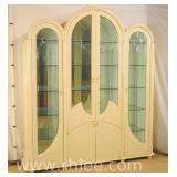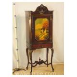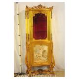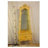 Carved decorated French style curio cabinet; 68-989 - mirrored back with lighted interior - (missing 1 glass shelf, chip on 1 shelf; finish as-is) - 24.5x12x75.5