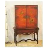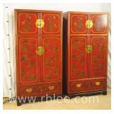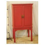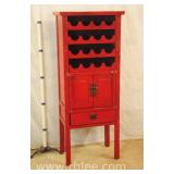 Red rustic Oriental style wine cabinet with raised panel doors; 68-872 - removable wine bottle racks - 2 doors over 1 drawer - (paint chips) - 26x17x63.5
