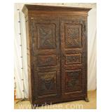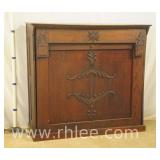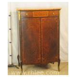 Carved mahogany French style blind door cabinet with decorated door; 620-250 - ornate stretcher base - 1 door over 1 drawer - 27.5x16x70.5