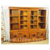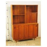 Walnut mid-century 2 part hutch with tambour doors; 620-246 - sliding doors on base - (loose strip of veneer on bottom) - 48x18x68.5