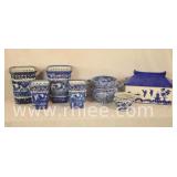 Group of 7 misc pieces of blue and white items; 803-119 - planters, container with lid