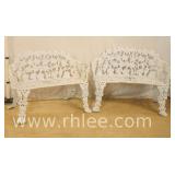 Pair of white cast iron garden benches; 68- - grapevine pattern - (each has a broken back right leg) - 38x17x27.5